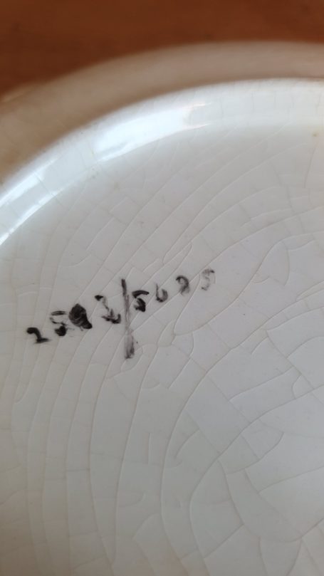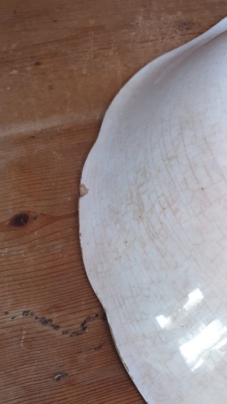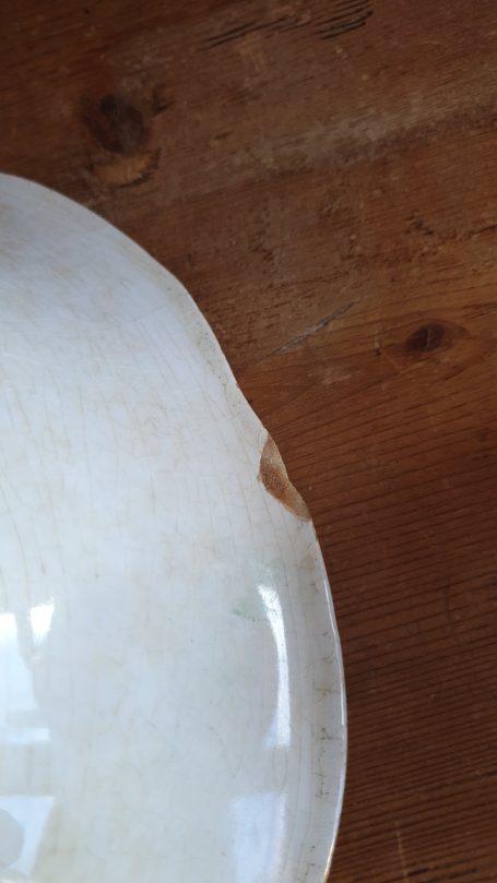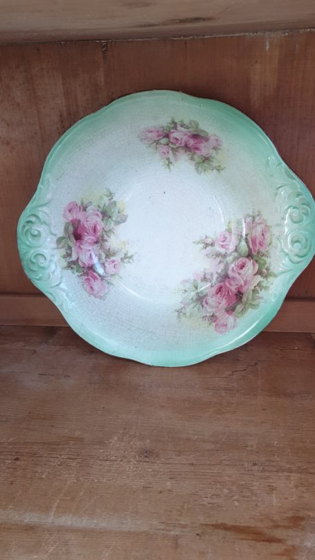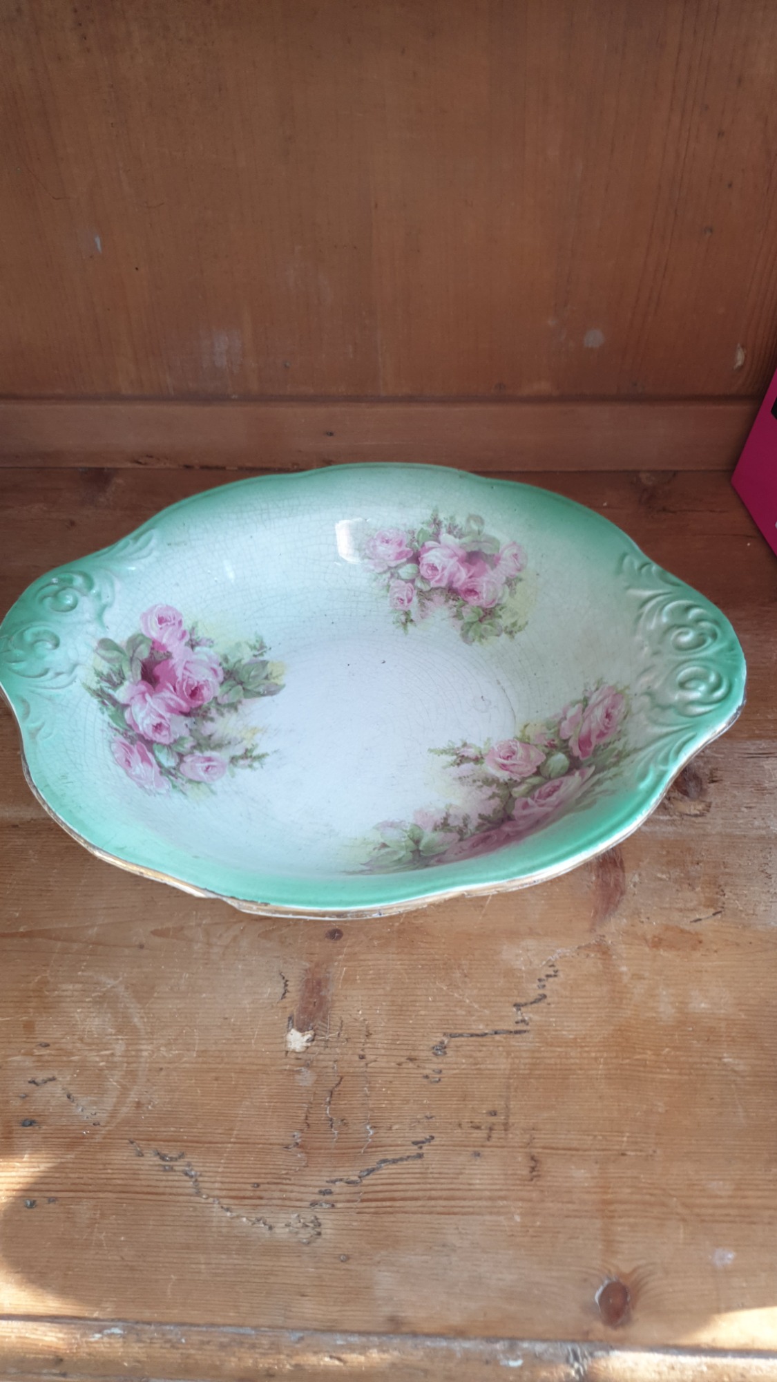 This might be a Sevres large serving bowl with a pale yellow and green interior, featuring hand-painted pink roses and small white flowers.