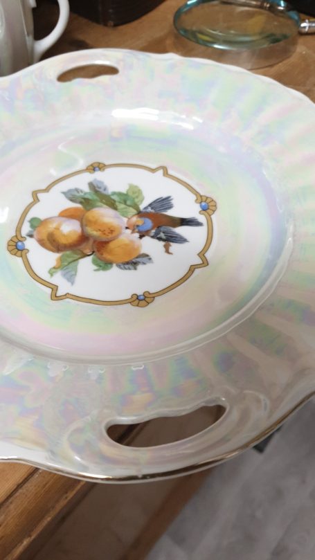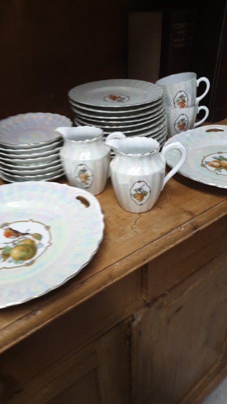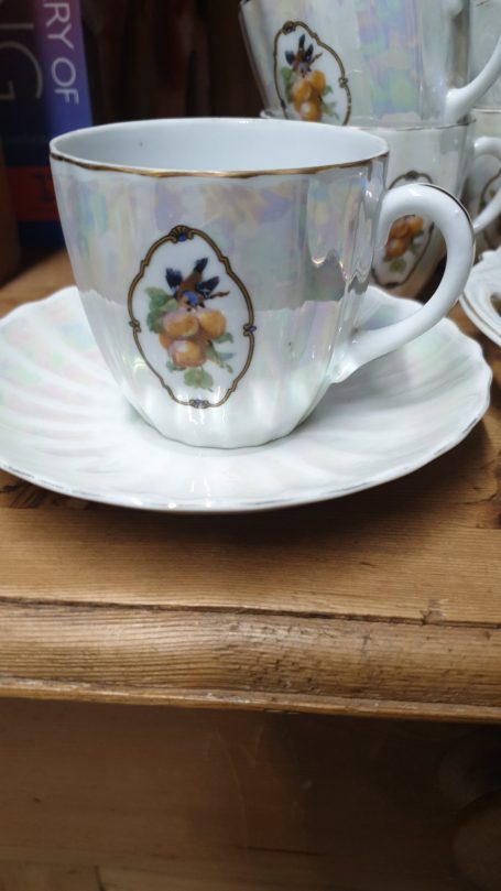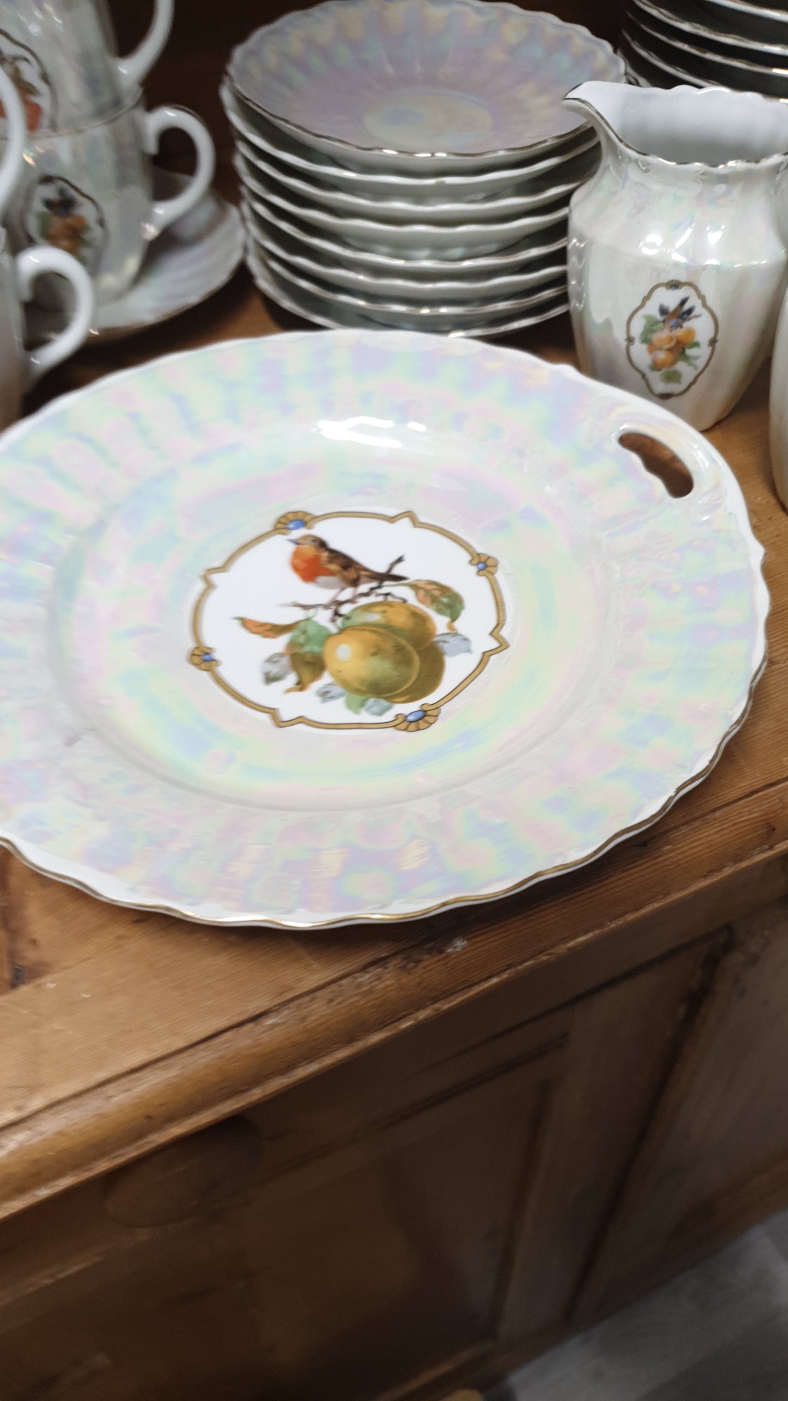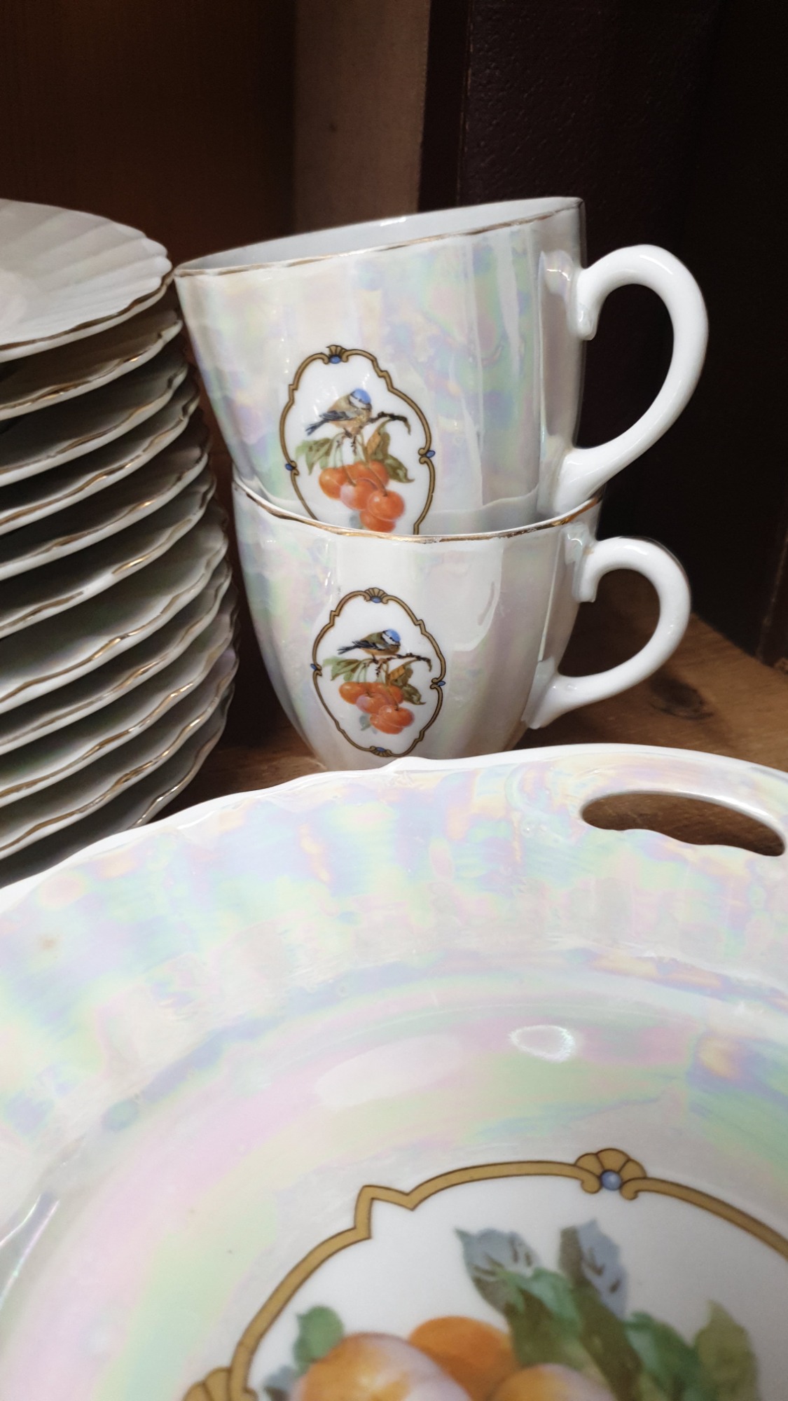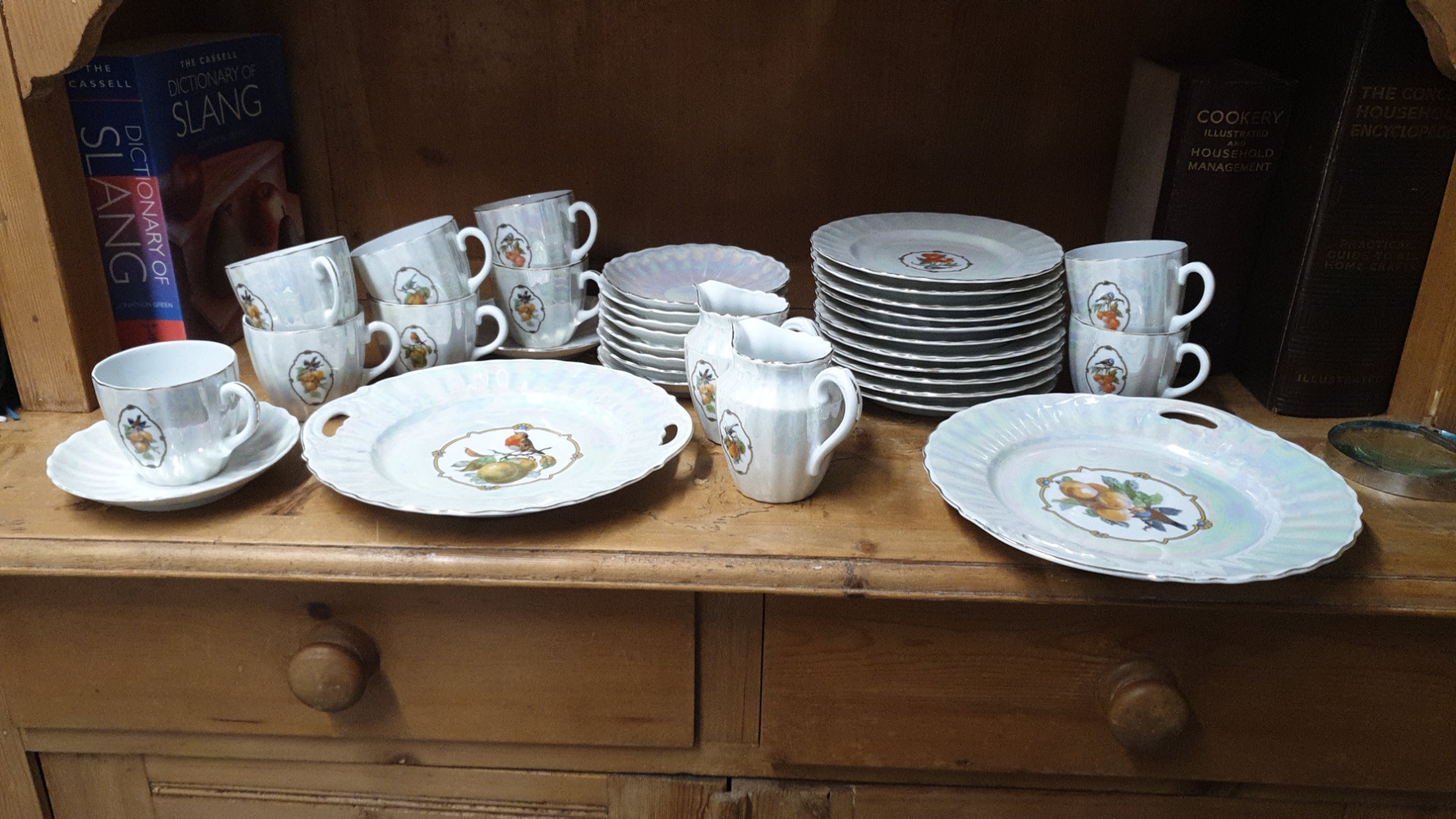 This is a collection of vintage, iridescent, fruit-patterned earthenware crockery, including teacups, saucers, plates, and a creamer jug. The items appear to feature a transferware design of various fruits and leaves with gold-rimmed edges.