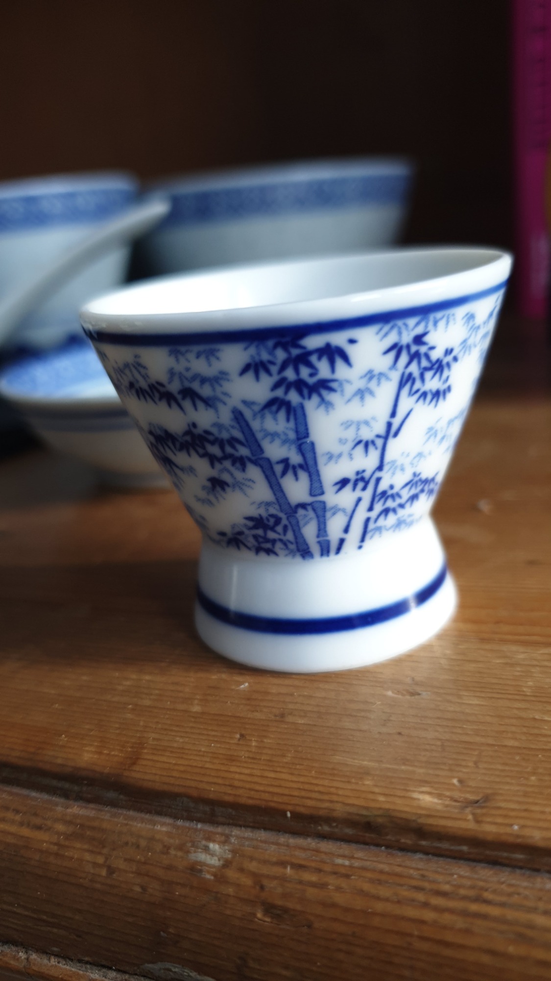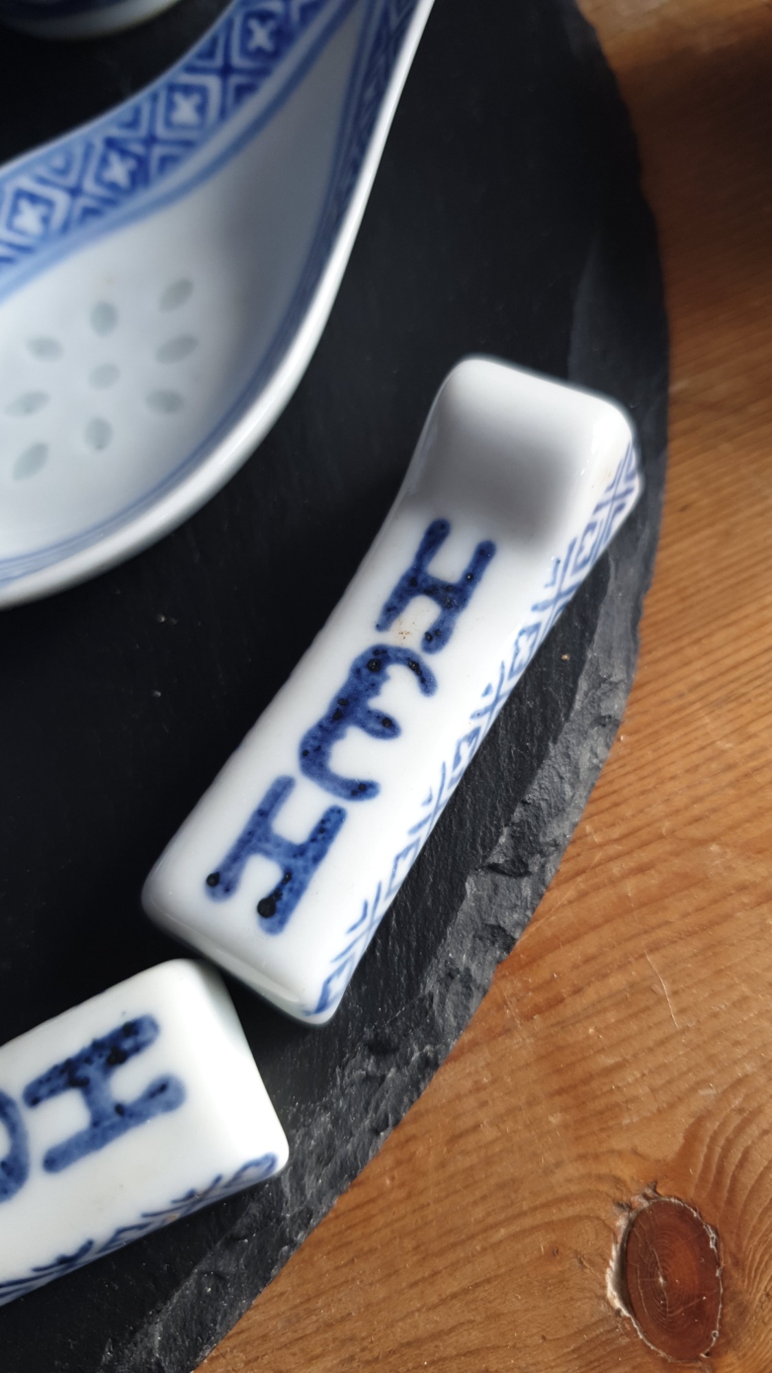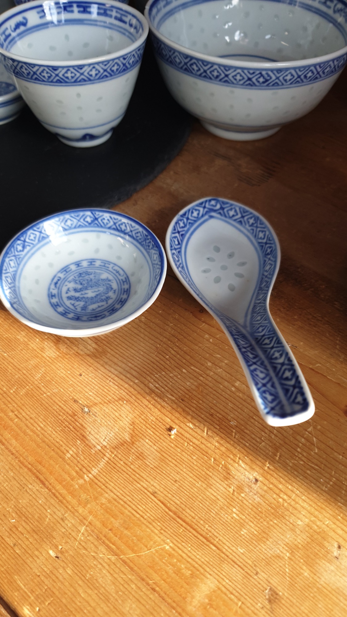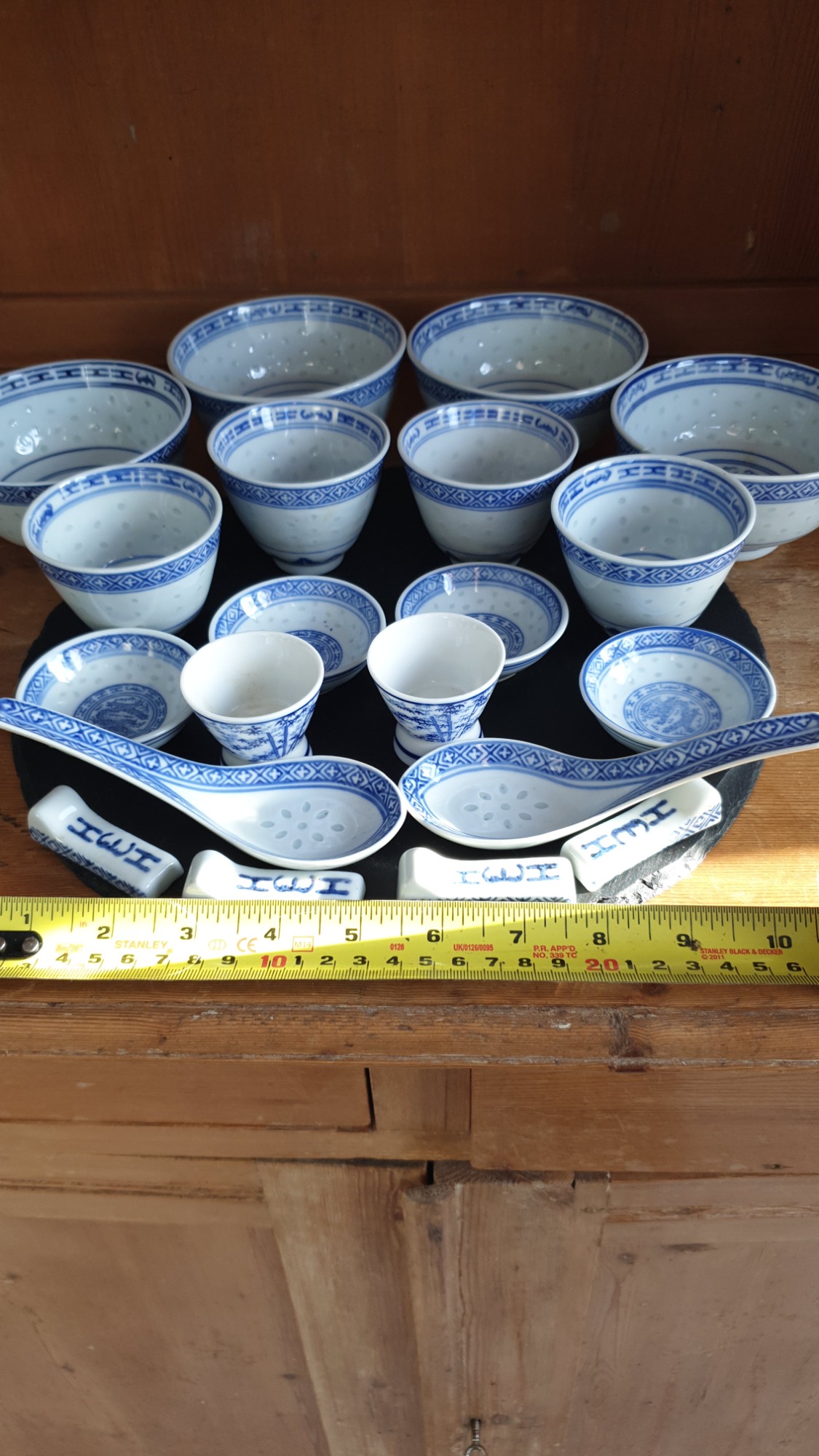 The set includes various sizes of bowls, cups, and large serving spoons, all adorned with the blue decorative pattern around the rim and base