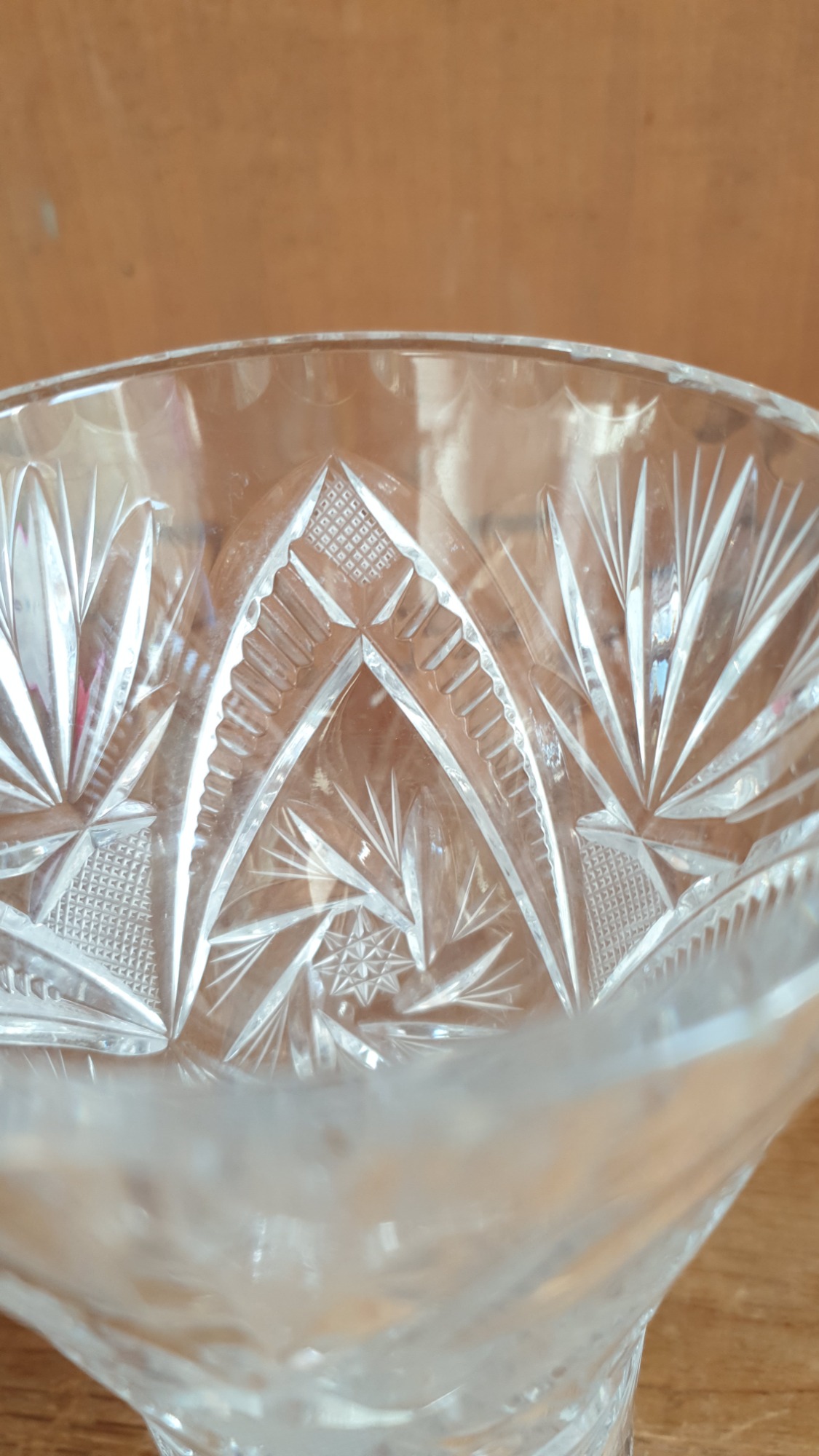 This is a vintage hand-cut crystal vase, possibly from Bohemia or Poland, featuring a traditional geometric design with diamond and star patterns.