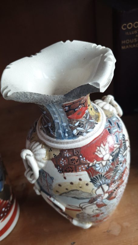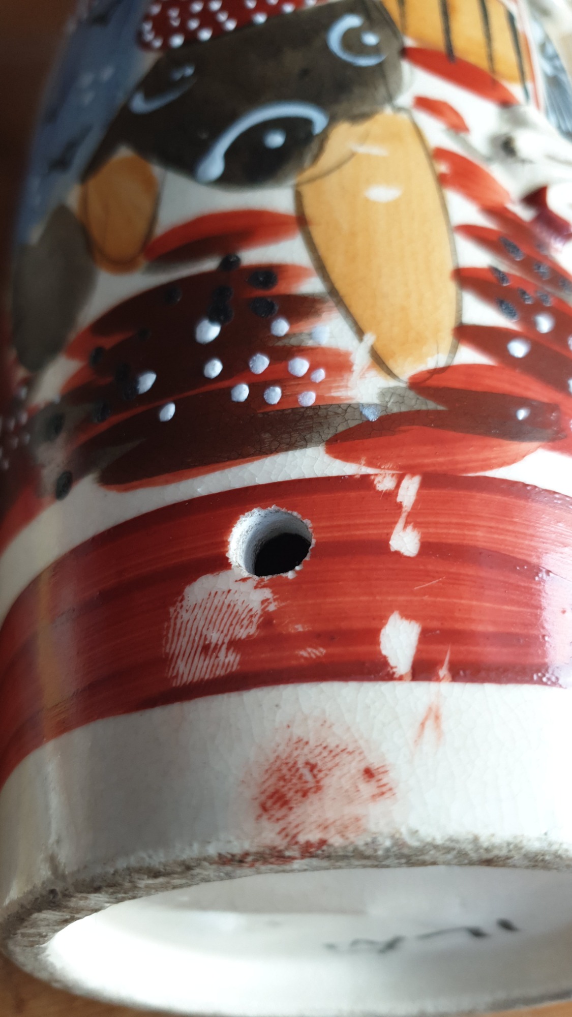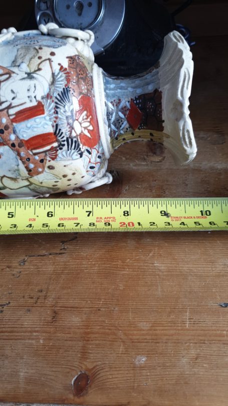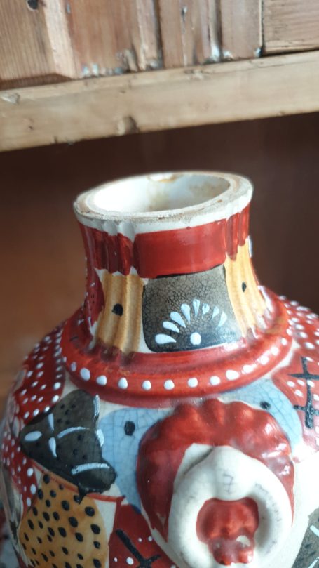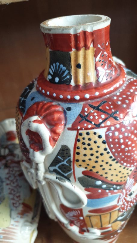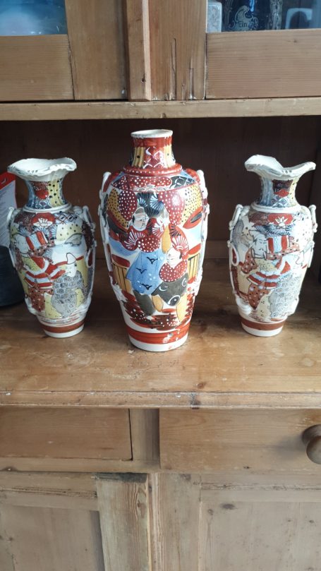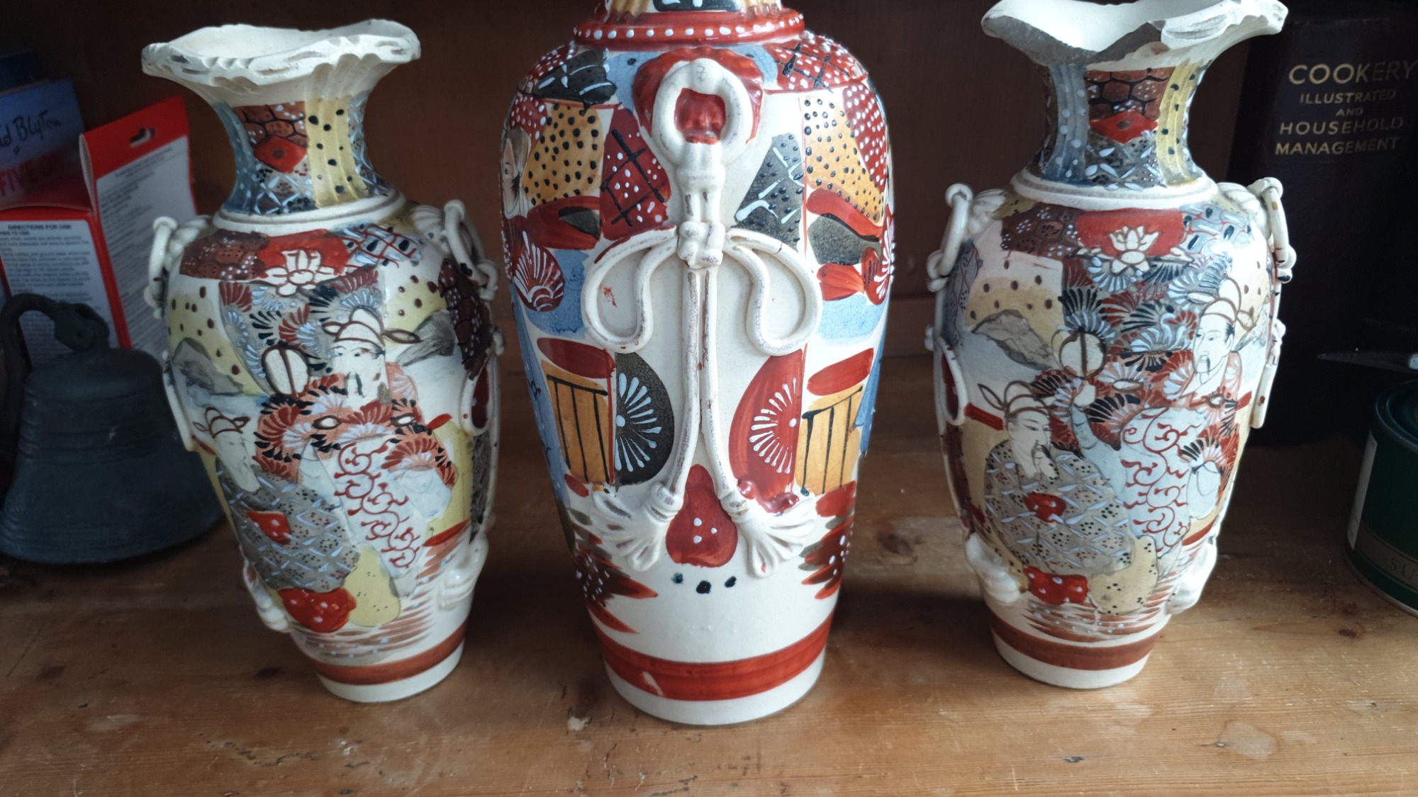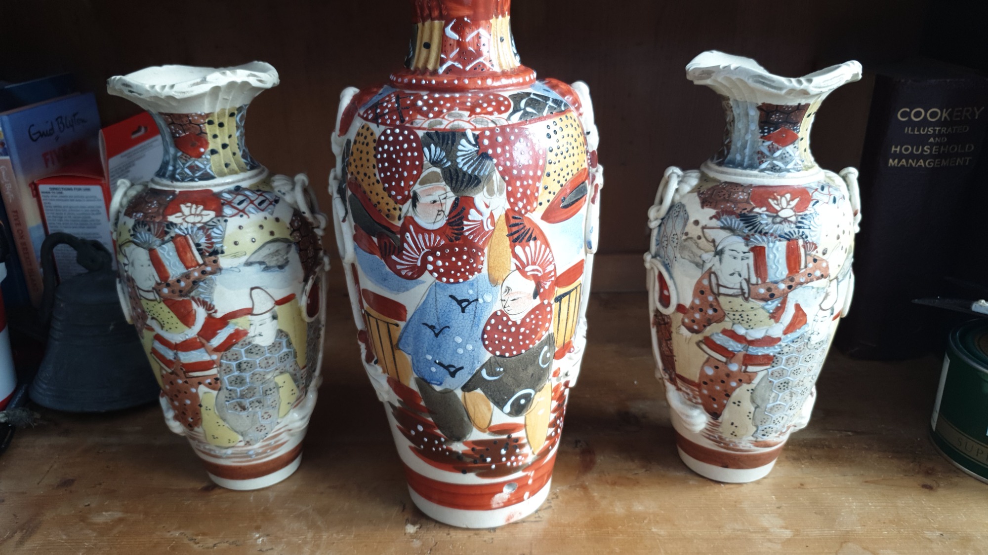 Three Japanese Satsuma Ware Vases. The vases are richly decorated with polychromatic enamel designs, including red, blue, green, and yellow.