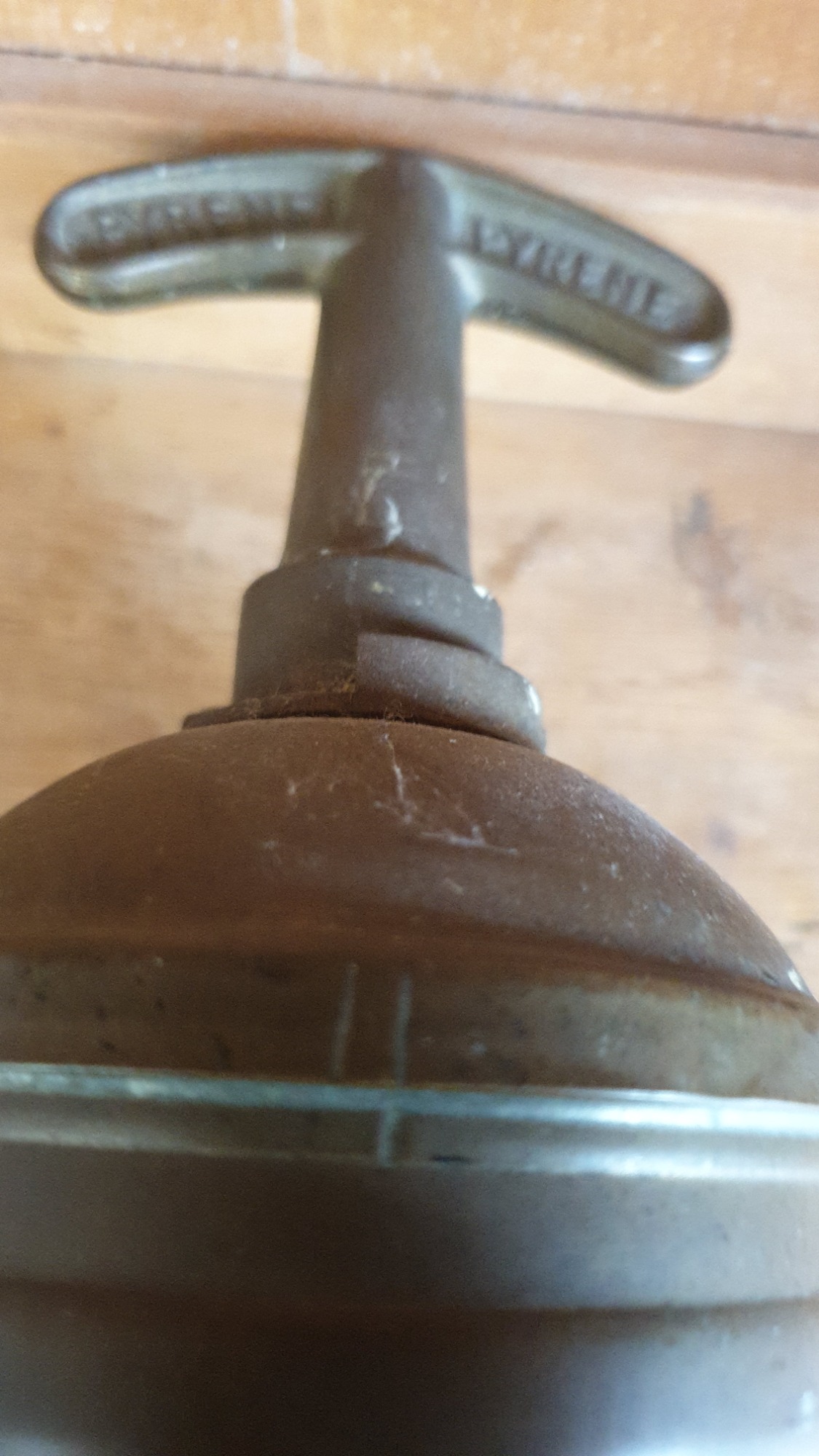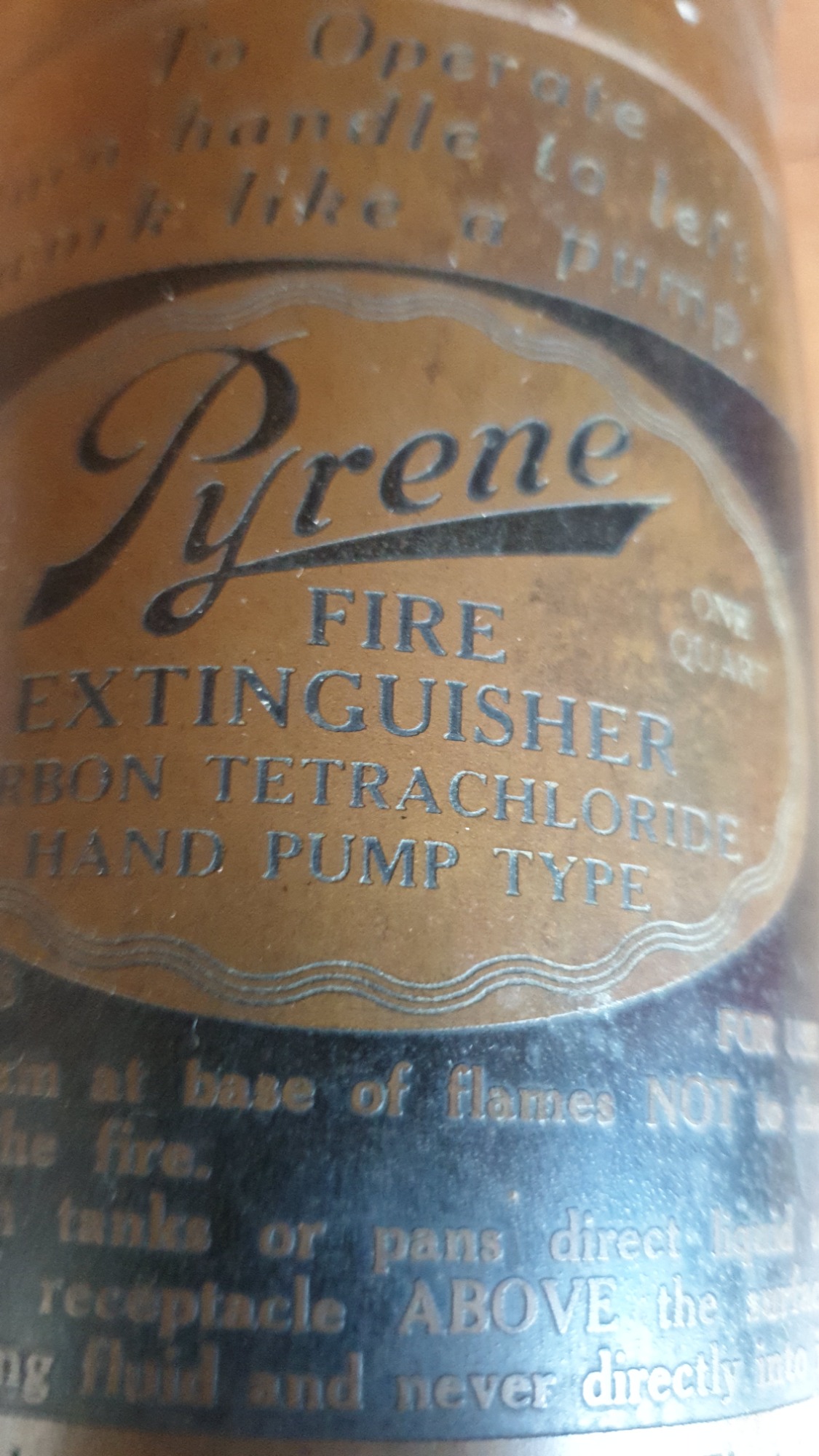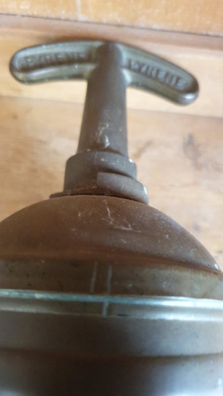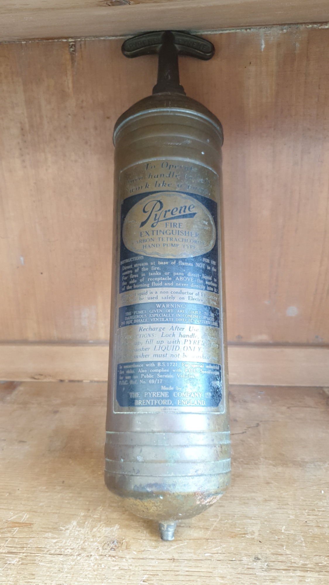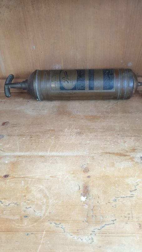 A vintage brass Pyrene hand pump type fire extinguisher.
