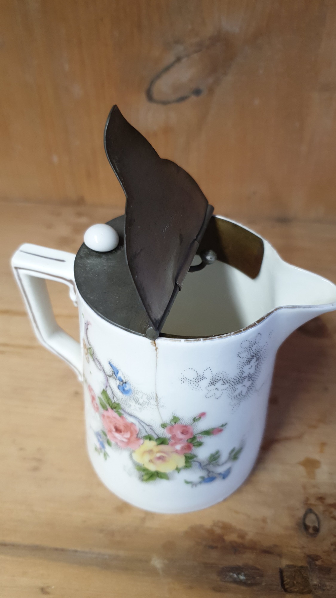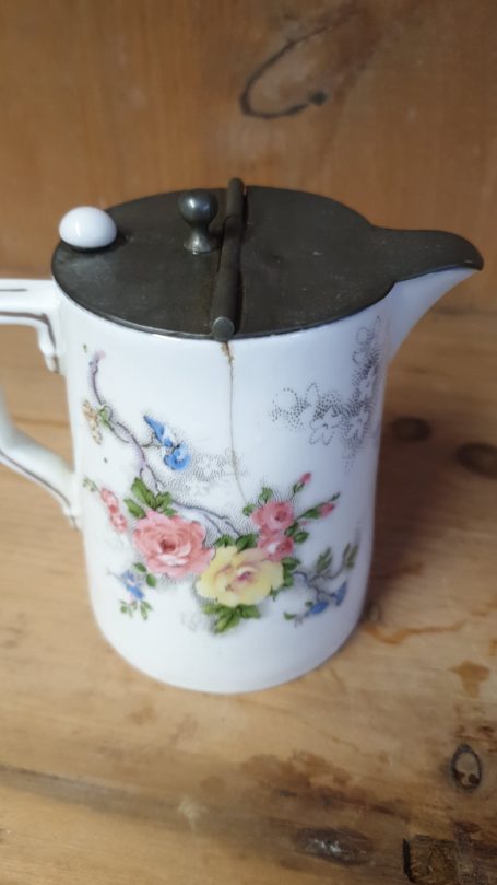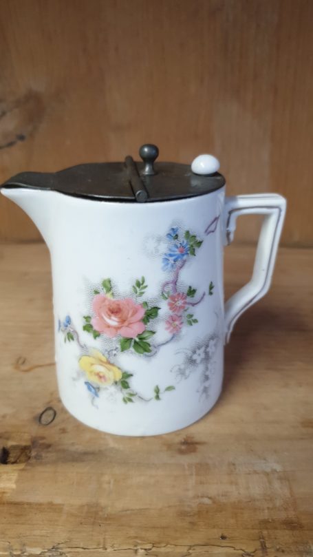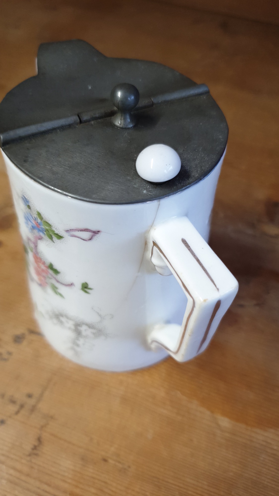 - It has a metal lid with a small white finial, typical of early 20th-century designs.