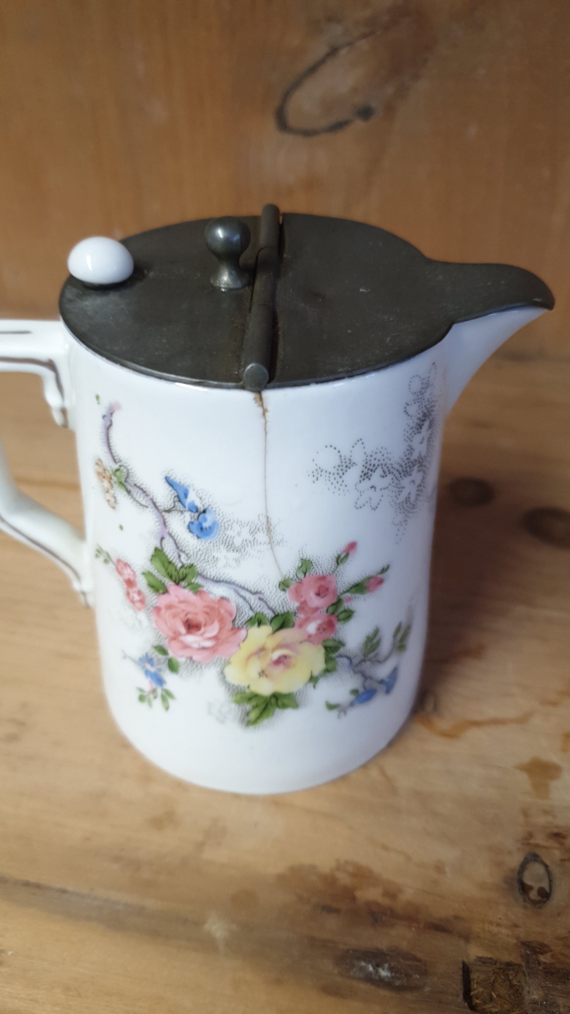 A vintage lidded jug or creamer, possibly in the early "Laburnum" pattern.