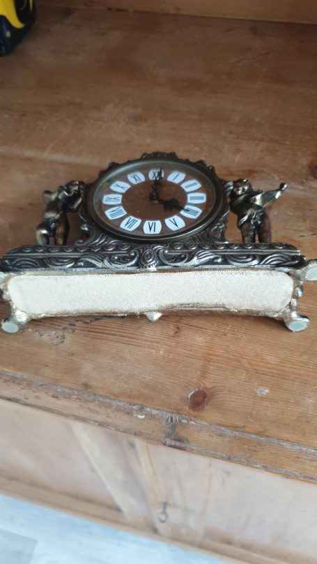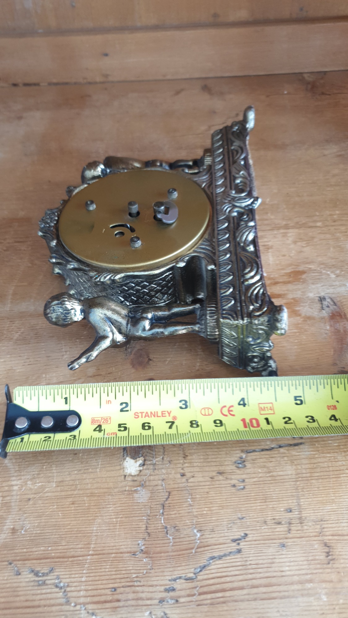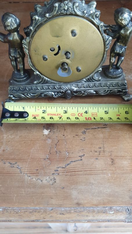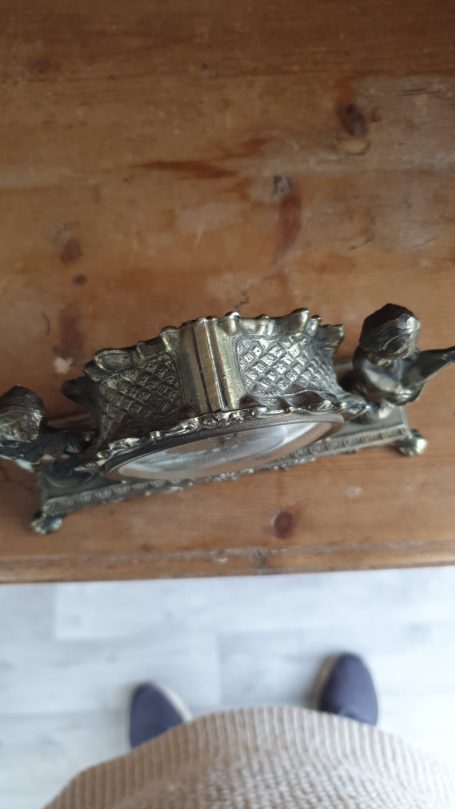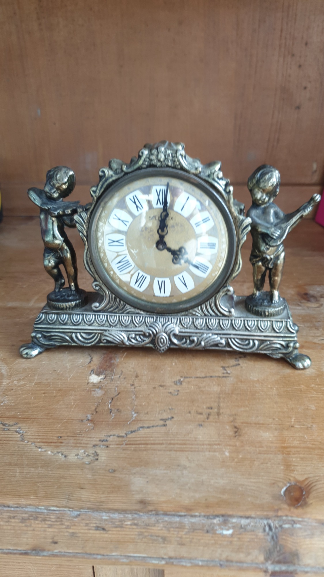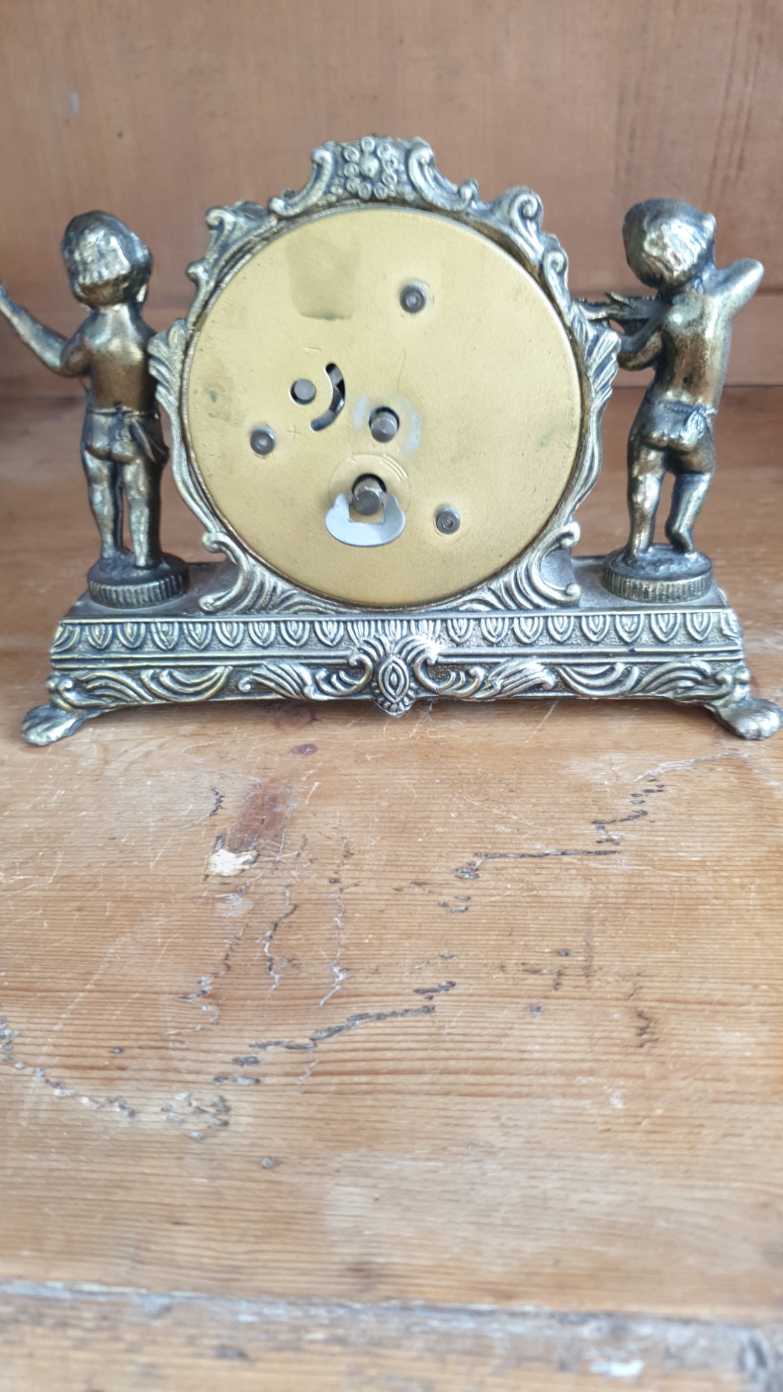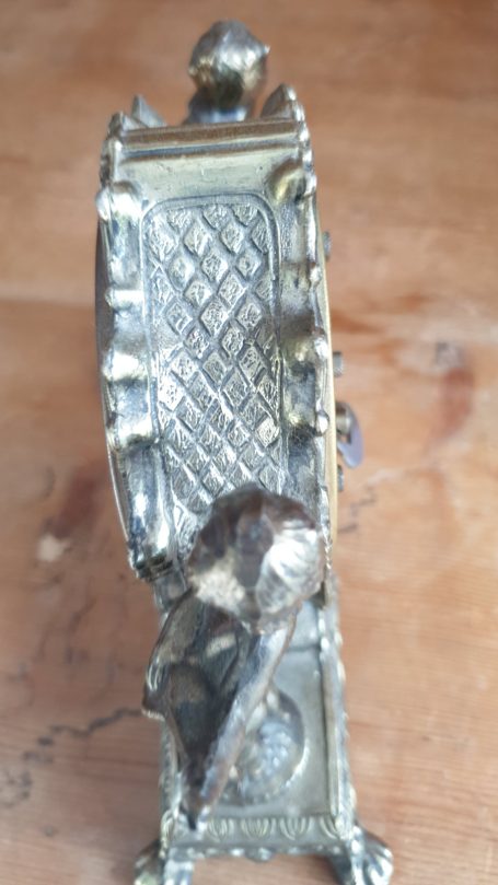 The ornate case, likely made of brass or a similar metal, features two cherub figures, one holding cymbals and the other a lute-like instrument.